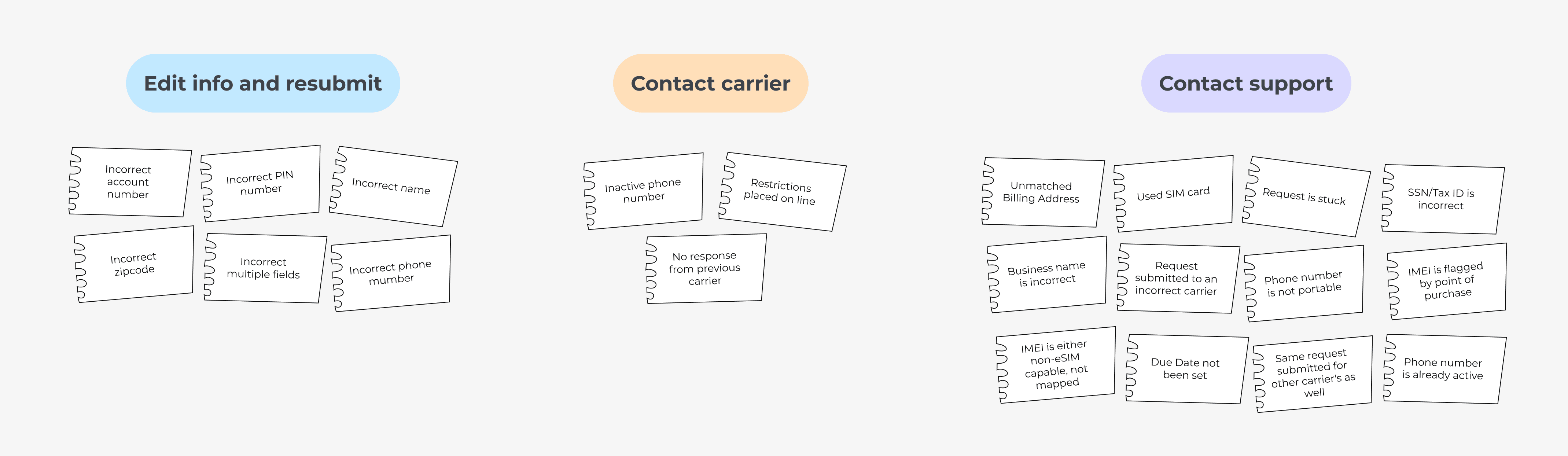 Errors happen, but showing 20+ error scenarios as unique states would overwhelm both users and the system. To keep the experience clear, I mapped each error to the next action users needed to take and grouped them into three consistent paths: Edit info, Contact carrier, Contact support.