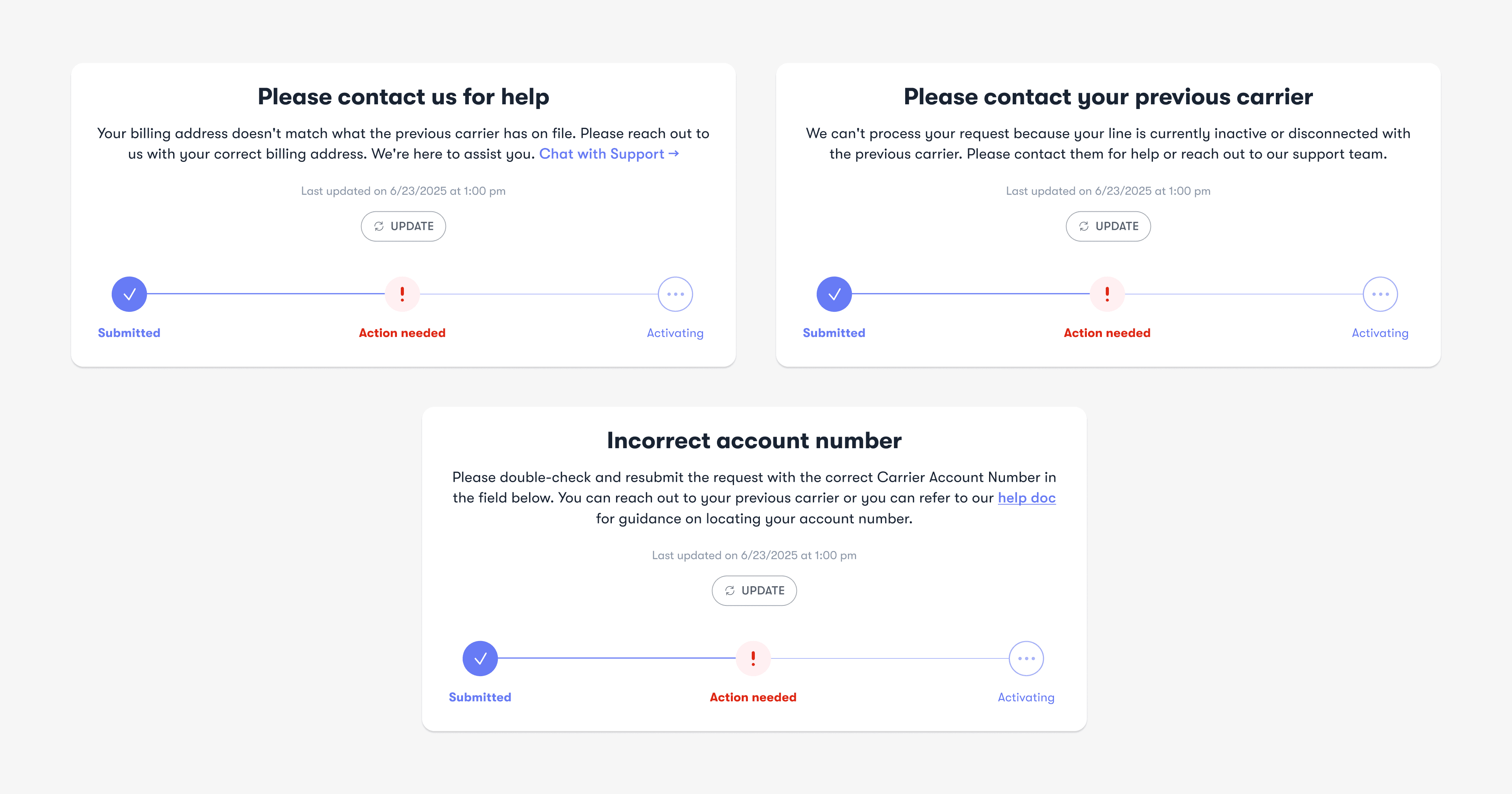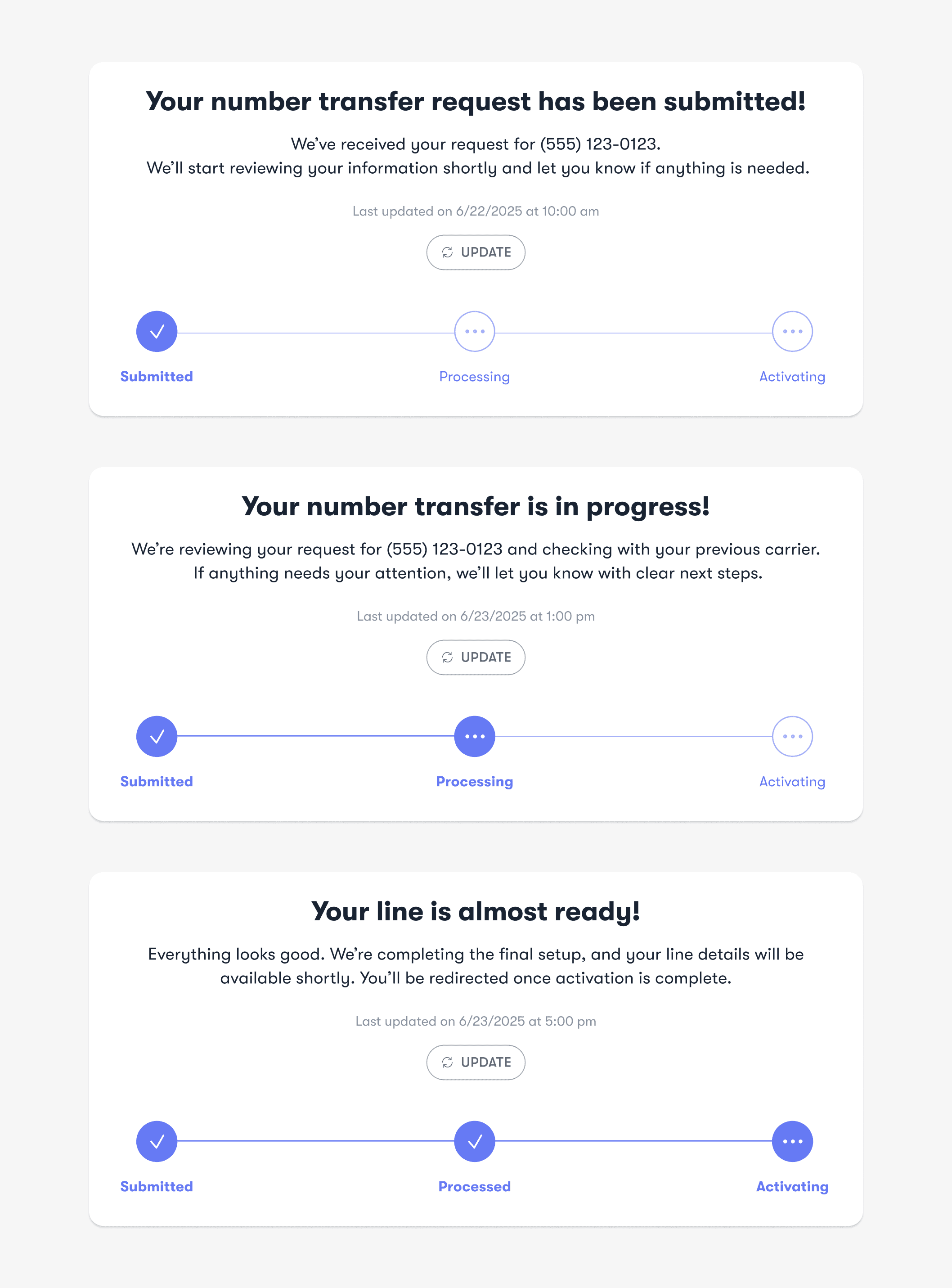 Based on the backend status logic and discussions with PM and engineering, we landed on a 3-step progress model: Submitted → Processing → Activating. This framework supported both number transfer and new number flows, keeping the experience consistent while reducing implementation complexity. Most importantly, it stayed simple enough for users to understand at a glance.