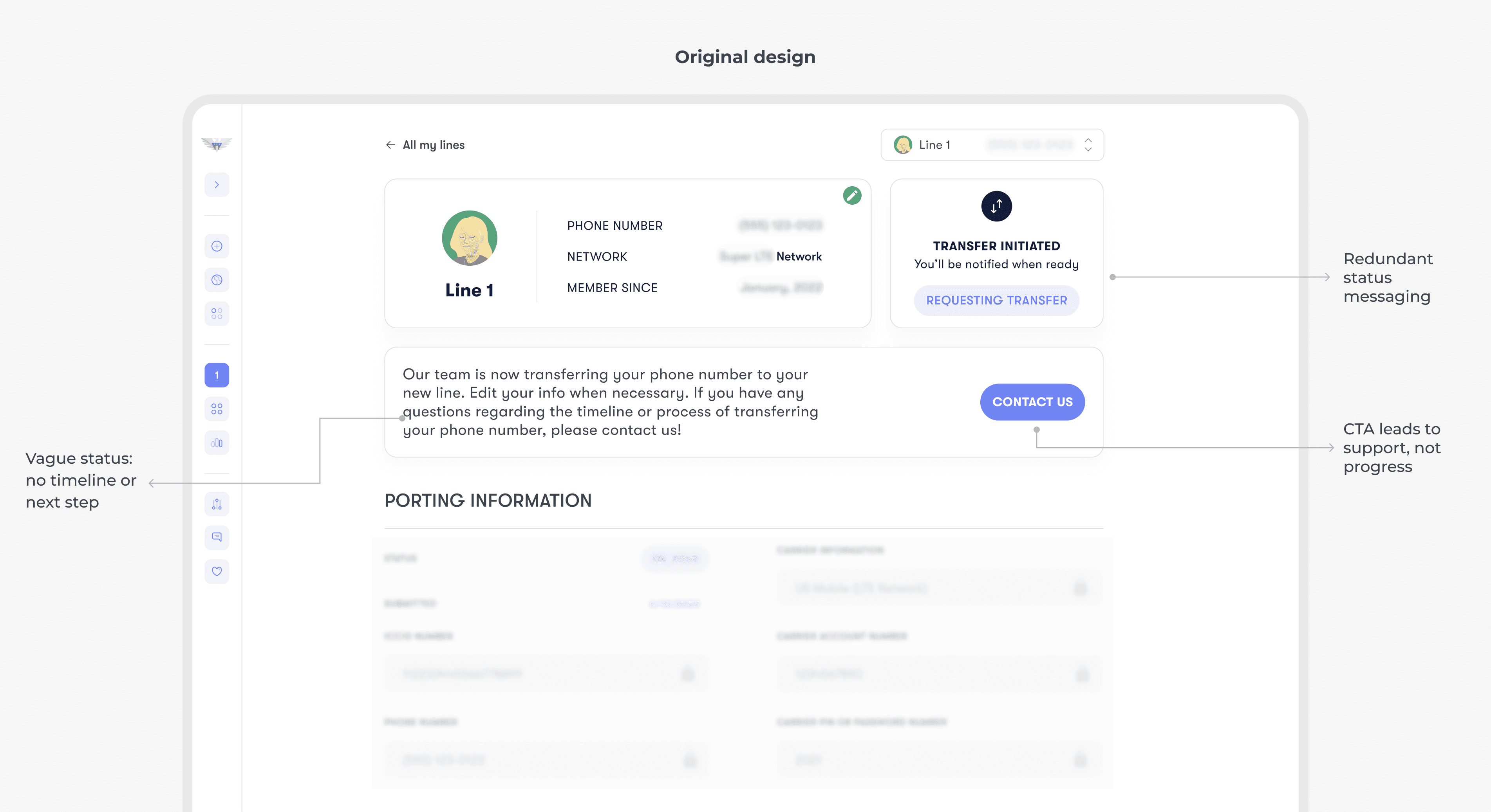 After users purchase a new line or start a number transfer, they land on a dashboard that essentially says: “We’re working on it, please wait.” Without a clear timeline, progress, or next steps, the waiting period feels uncertain, especially when users temporarily lose signal and assume something went wrong.