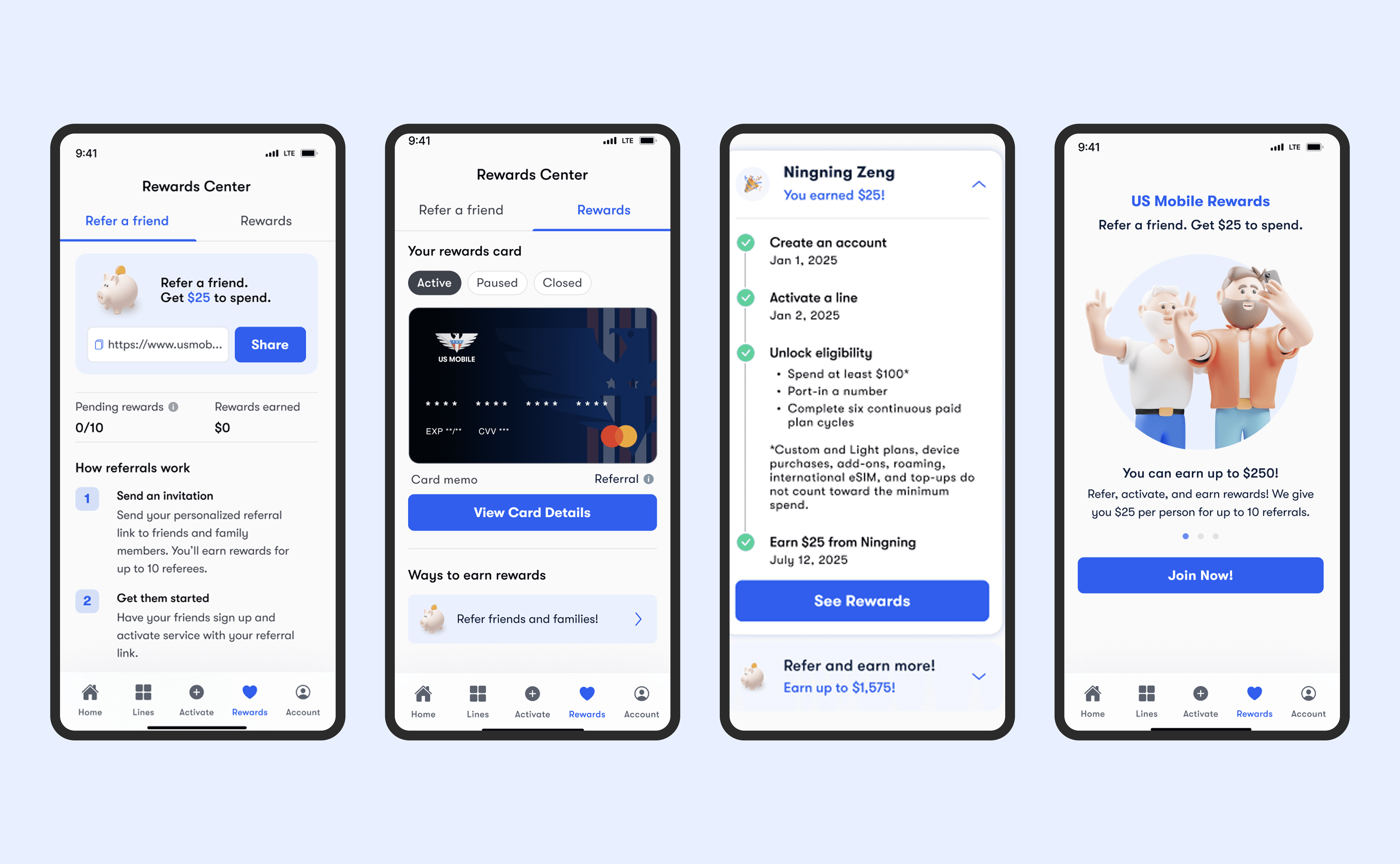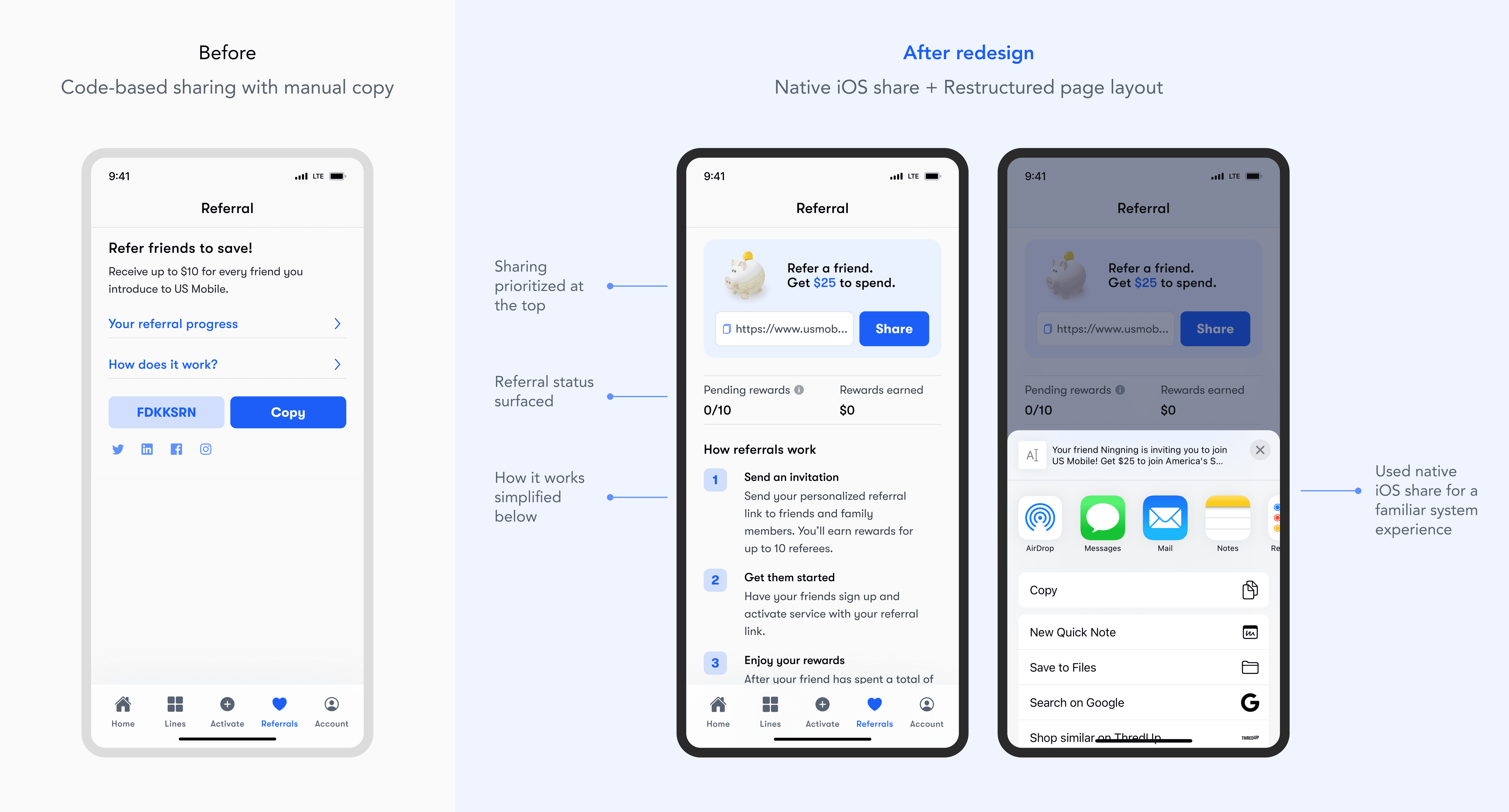 From 2023 to 2025, we evolved a simple referral page into a scalable rewards center supporting user growth and engagement. Referral has always been a key part of US Mobile’s growth, with a dedicated bottom navigation tab and strong emphasis on word-of-mouth sharing. As the sole UX designer, I led multiple key releases, redesigning referral flows, refining reward structures, and introducing referral tracking to improve clarity and conversion.