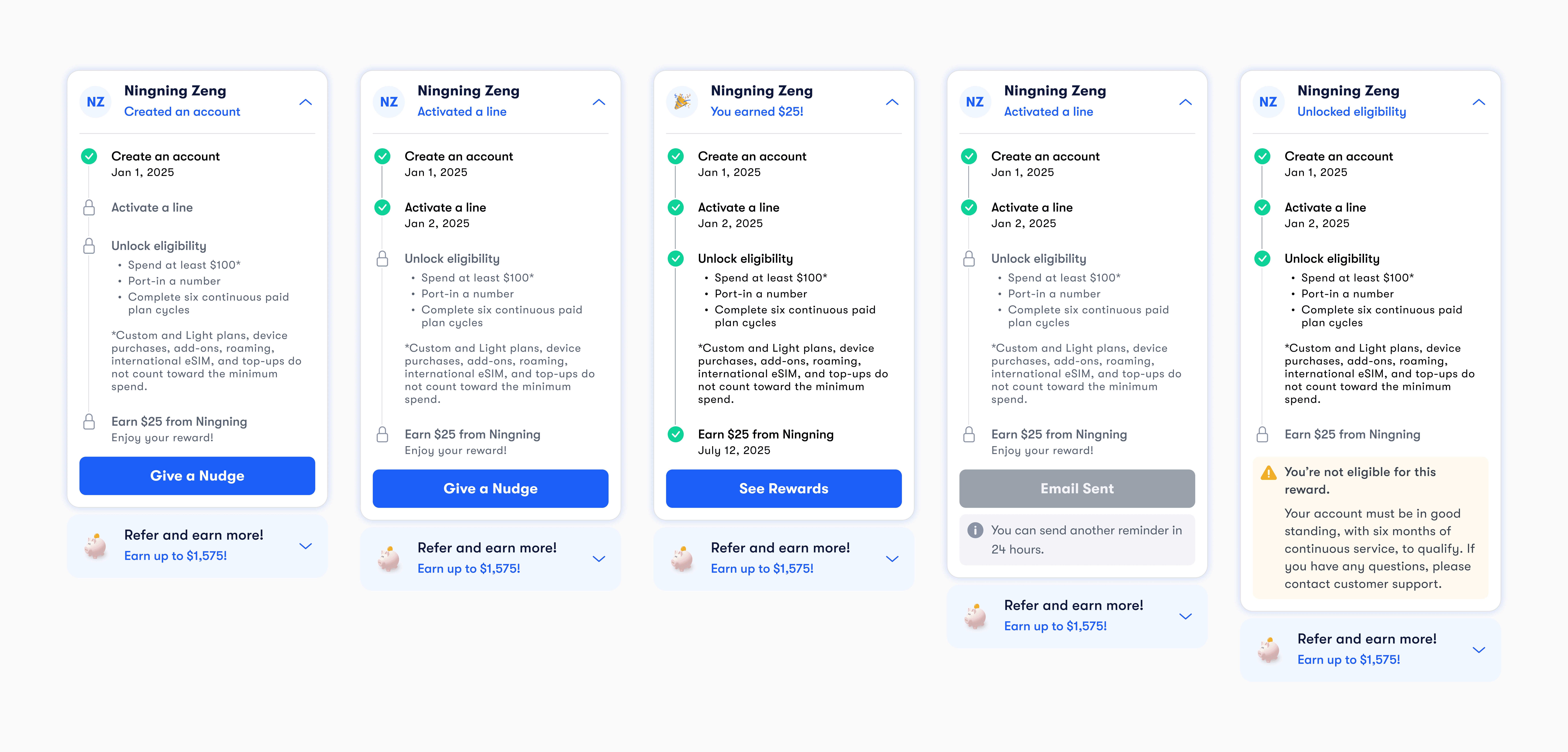 Although the long term roadmap included additional earning programs, the MVP centered on referral. At the same time, rewards are only issued after a six month qualification period, meaning many users would see a zero balance for an extended time. To balance this, we introduced a two tab Rewards Center: Refer a friend to focus on earning actions, and Rewards to manage earned value when available. This structure kept referral as the primary driver while ensuring the system could scale over time.