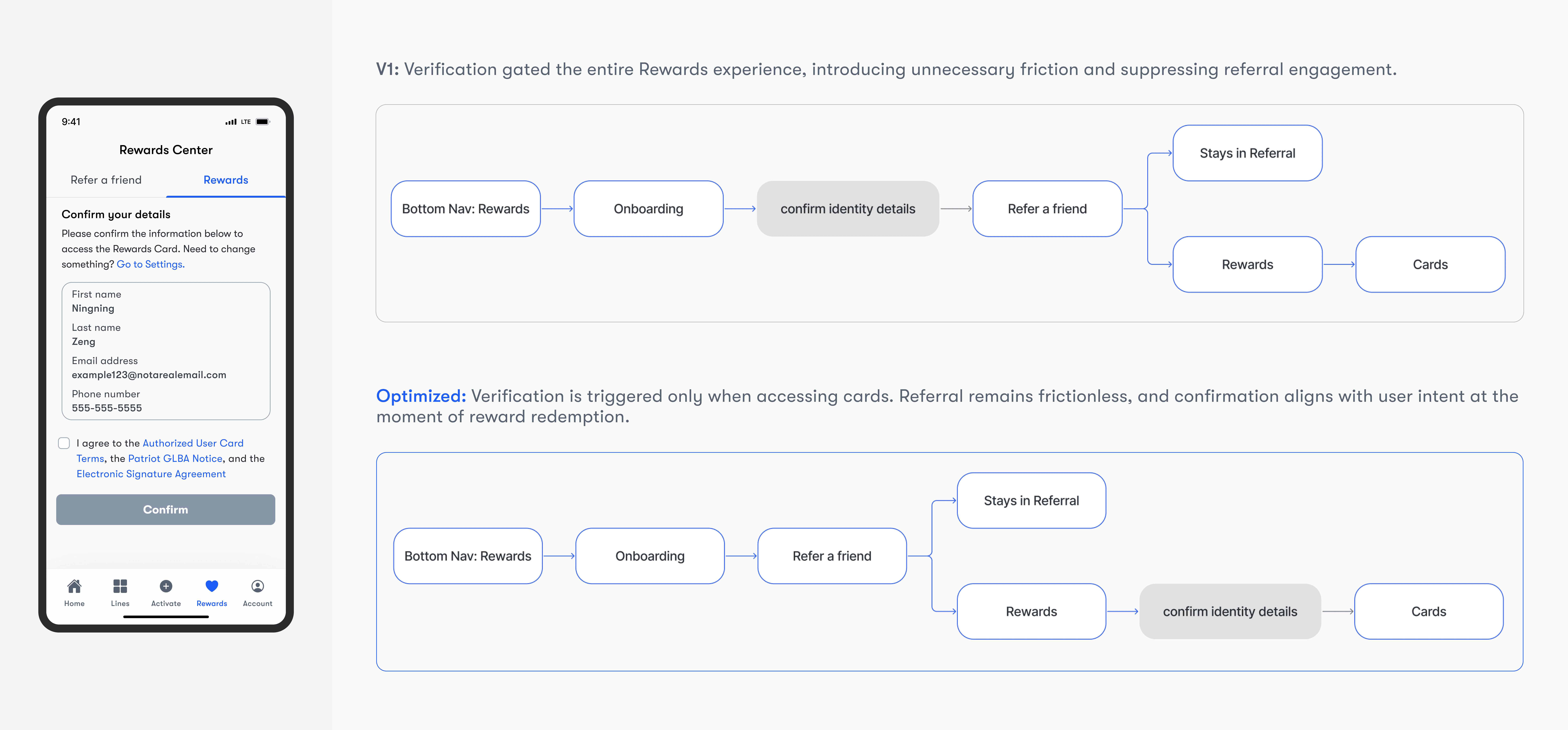 Because the rewards card was issued through a third-party partner, users needed to confirm their identity before activating a card. Close to launch, we were asked to add this verification step before users could access the rewards experience. Given the tight timeline, we first placed verification at entry to ensure compliance. After reviewing the requirement more closely, we confirmed that identity confirmation was only necessary before card issuance, not for referral. We then adjusted the flow, moving verification into the Rewards tab so users could continue referring friends without interruption, while still meeting compliance when they chose to access their card.