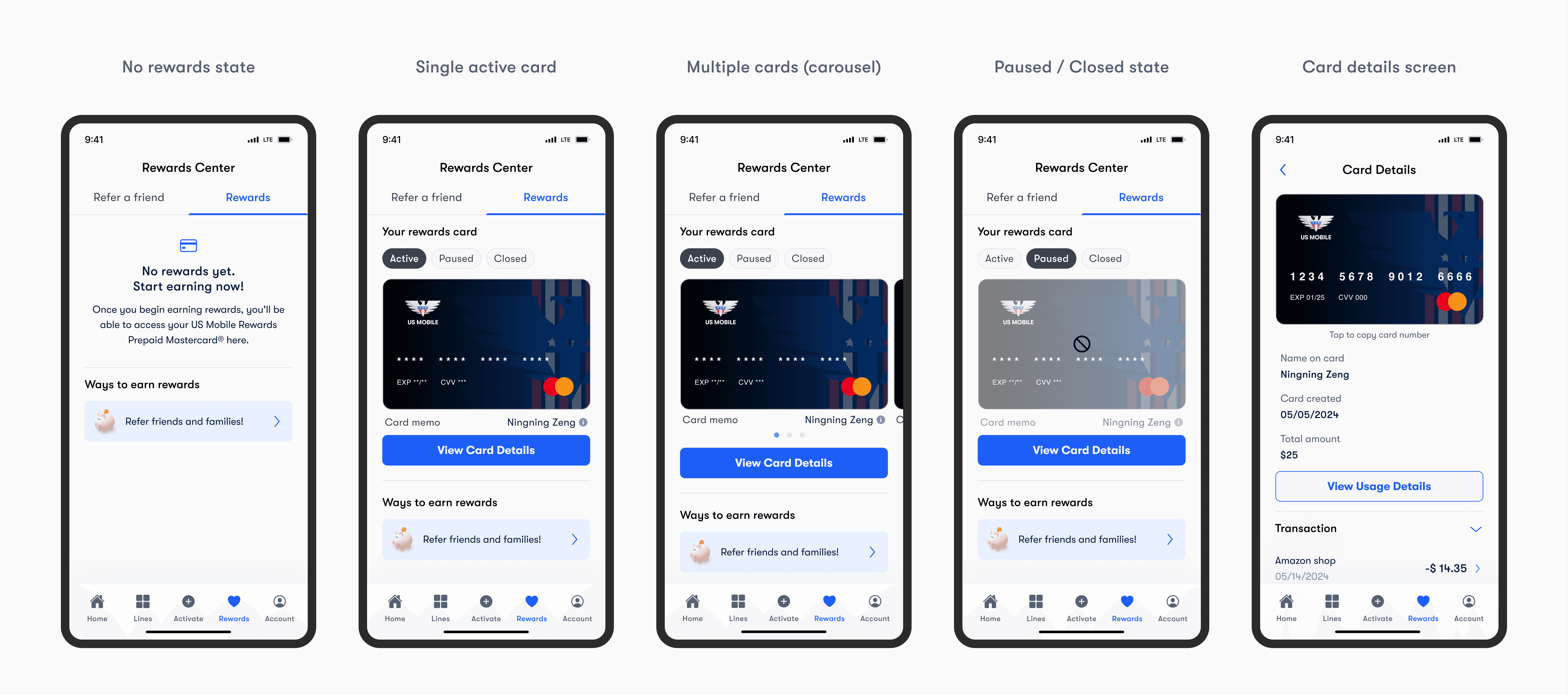 Introducing cash rewards required building a wallet-like card system from scratch. The experience had to support users with no cards, one or multiple active cards, and paused or closed states, while keeping access to card details, transactions, and usage rules intuitive. As the sole UX designer, I worked closely with the product manager to translate evolving third-party requirements into a clear and scalable rewards experience.