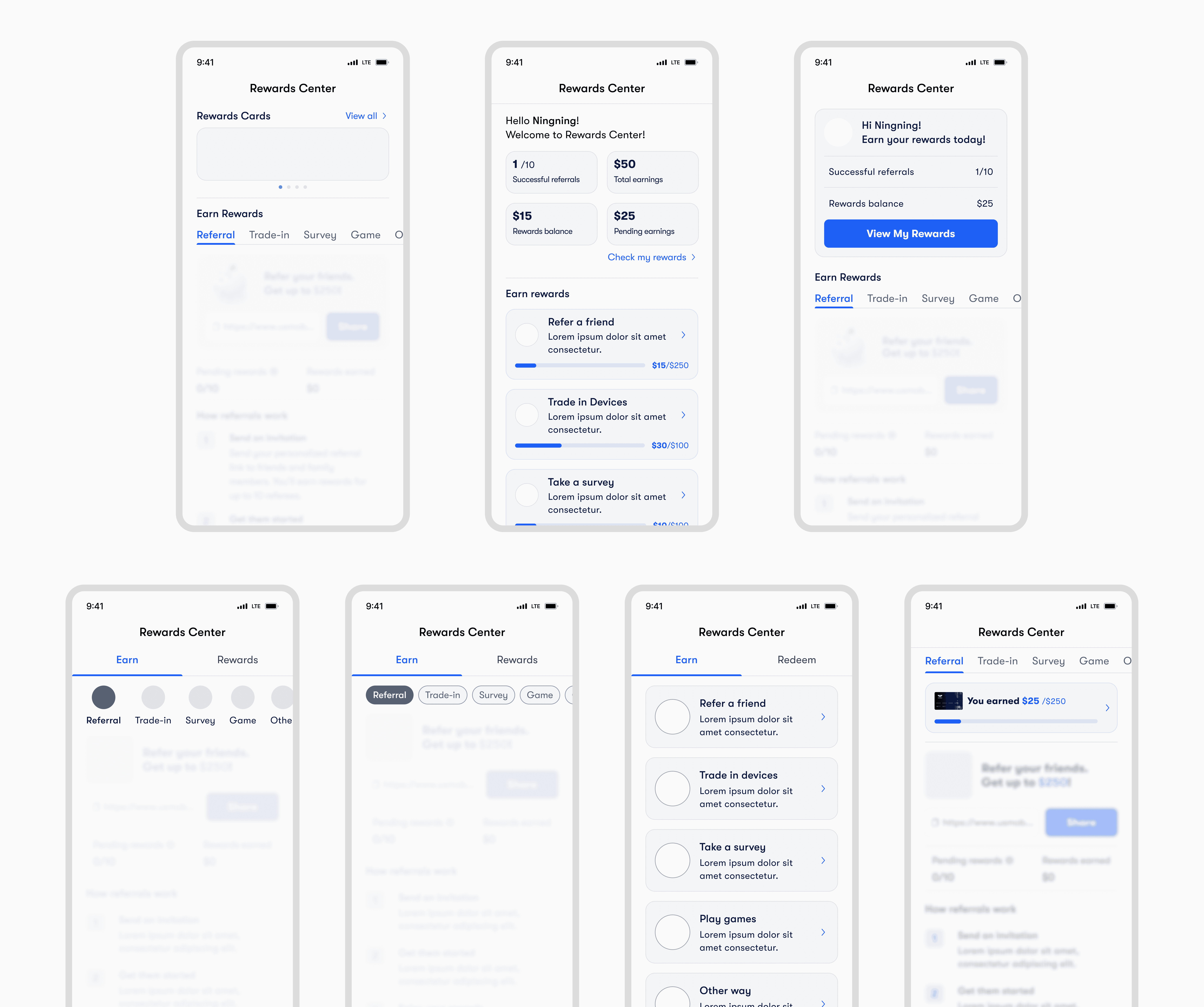 With this expanded vision, I explored several structural directions to evolve the referral page into a scalable rewards system. The main challenge was designing a layout that could support future earning programs while keeping referral clear and easy to access. I tested different ways of organizing earning opportunities and reward visibility, balancing long term flexibility with simplicity.